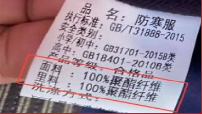 里料面料为不同材质时,应分别标注面料、里料(胆料)的成分及含量。有填充物的,应标明填充物种类,若填充物为羽绒,还应标明绒子含量及充绒量等(面料成分特殊要求:若执行标准为GB/T 31888-2015,校服直接接触皮肤的部分,其棉纤维含量标称值应不低于35%)。