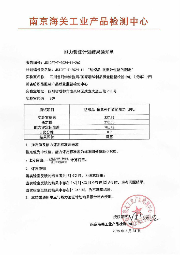 省纤检局获得“纺织品 抗紫外性能的测定”能力验证满意结果