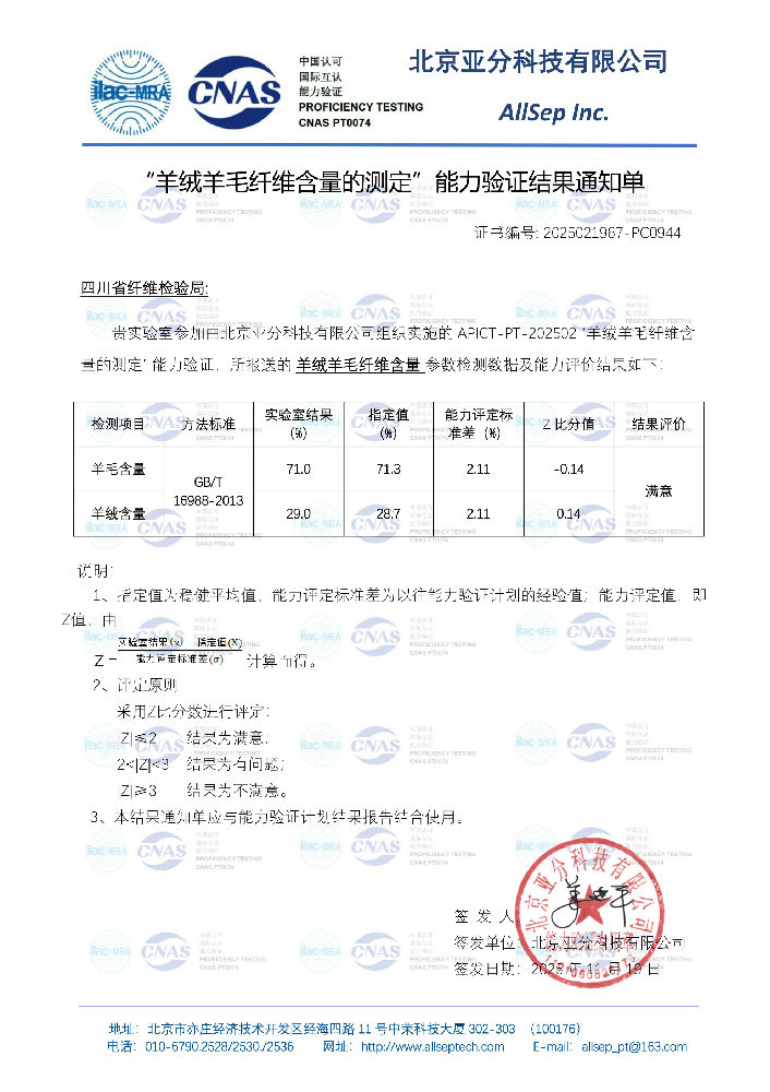 (成都)参加由北京亚分科技有限公司组织实施的“羊绒羊毛纤维含量的测定”能力验证,获满意结果。