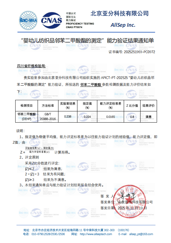 “婴幼儿纺织品邻苯二甲酸酯的测定”能力验证获满意结果。