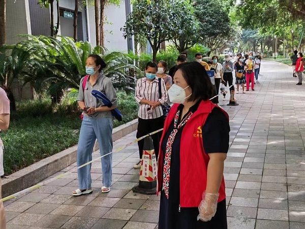 自成都市新型冠状病毒肺炎疫情防控指挥部发布关于在全市开展全员核酸检测的通告的第二天,三支部书记雍小勤率先垂范,第一时间对接所在社区,加入所在小区志愿者队伍中,以毫不退缩的姿态冲在抗“疫”一线,热情、耐心地引导居民进行核酸采样,维护核酸检测现场秩序。“请大家戴好口罩,保持一米间距”,尽管已是凌晨1点,但她依然坚持。“我是一名共产党员,大疫面前更应当冲锋在前,能为抗疫做一点力所能及的事情,我感到十分有踏实和开心”。